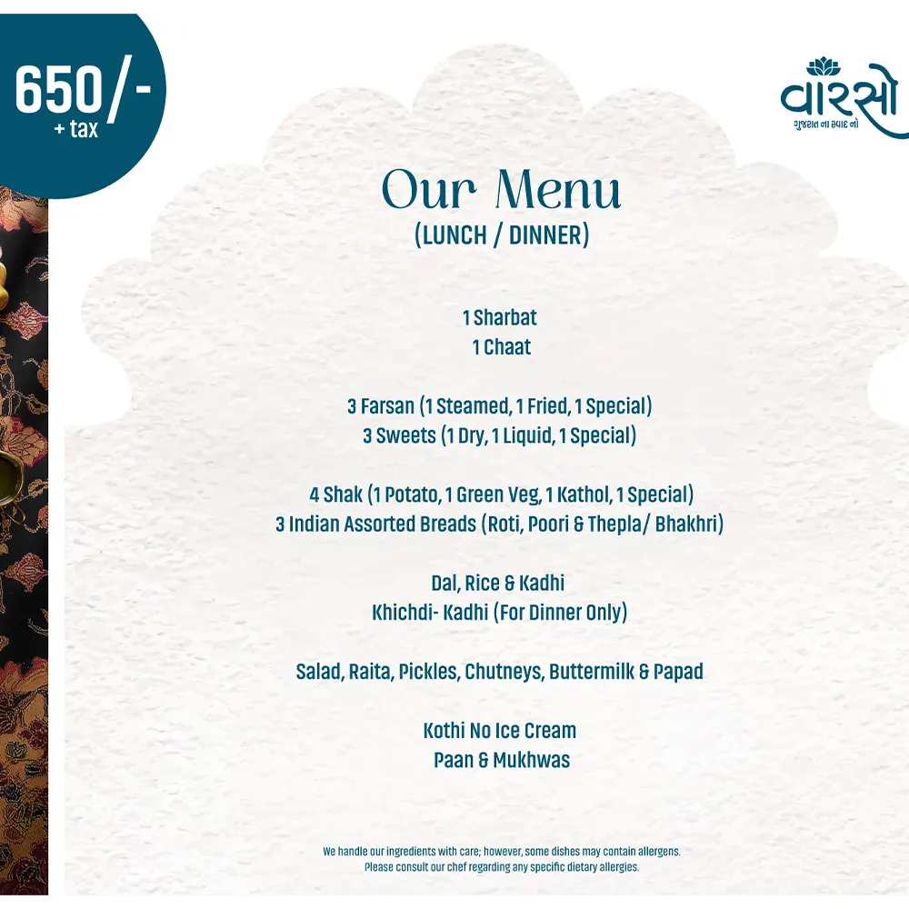 From the vibrant ambiance inspired by Gujarati artistry to the impeccable service, every detail is designed to offer a memorable journey. Vaarso is not just a restaurant—it is an experience where heritage meets sophistication, inviting true food lovers to savor the richness, diversity, and warmth of Gujarati cuisine in its most luxurious form.